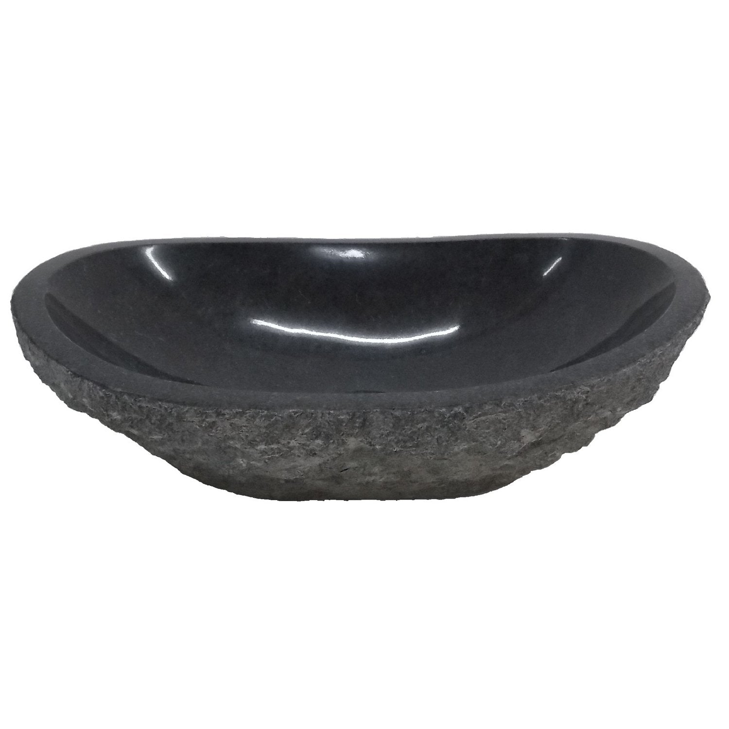 A: A canoe-style vessel sink made from Padang Dark granite with a natural split (rough) exterior.